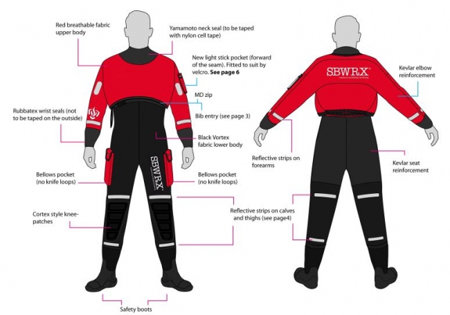 Om de zichtbaarheid van het pak te vergroten zijn er reflectoren geplaatst op de armen en benen aan voor en achterzijde van het pak. Verder is het pak voorzien van twee pockets op de benen en een houder voor een flaslight of een backup lamp. Op het zitvlak is kevlar bescherming aangebracht, om slijtage te voorkomen. Verder is het pak voorzien van veiligheidschoenen met een composiete neus en voetplaat. Optioneel kan het pak met latex of neopreen seals worden uitgerust.